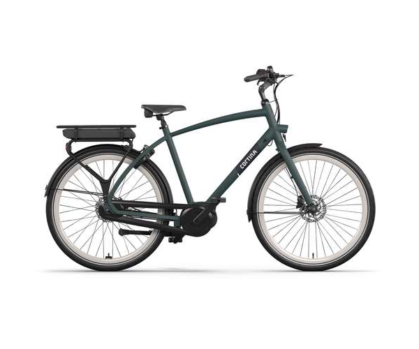 Cortina E-Tide elektrische herenfiets in framemaat 57cm. Kleur: Dark Juniper Green Matte. Uitgerust met achter een Shimano Nexus 7 versnellingsnaaf, hydraulische schijfremmen voor en achter. De achterdrager is voorzien van MIK-HD, waardoor je makkelijk en snel accessoires kunt bevestigen, ook kinderzitjes voorzien van MIK-HD kunnen makkelijk worden bevestigd. De Cortina E-Tide werkt met een Bosch ActiveLine systeem met middenmotor. Wordt geleverd ZONDER accu en acculader. Opvallende details: Aluminium frame.