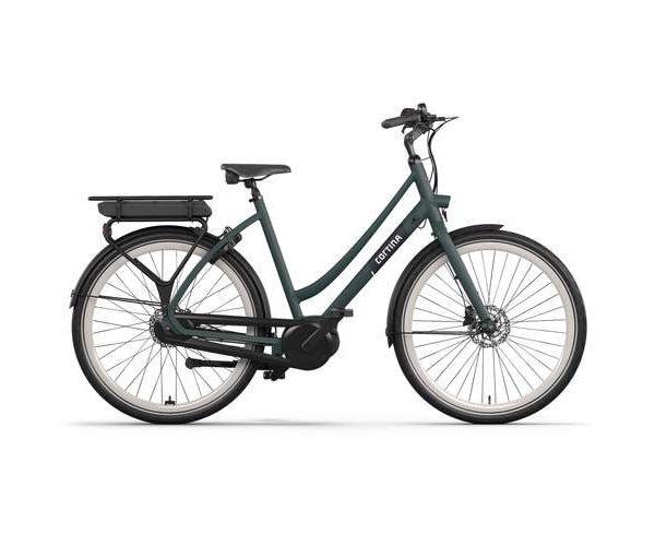 Cortina E-Tide elektrische damesfiets in framemaat 50cm. Kleur: Dark Juniper Green Matte. Uitgerust met achter een Shimano Nexus 7 versnellingsnaaf, hydraulische schijfremmen voor en achter. De achterdrager is voorzien van MIK-HD, waardoor je makkelijk en snel accessoires kunt bevestigen, ook kinderzitjes voorzien van MIK-HD kunnen makkelijk worden bevestigd. De Cortina E-Tide werkt met een Bosch ActiveLine systeem met middenmotor. Wordt geleverd ZONDER accu en acculader. Opvallende details: Aluminium frame.