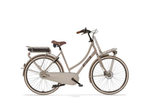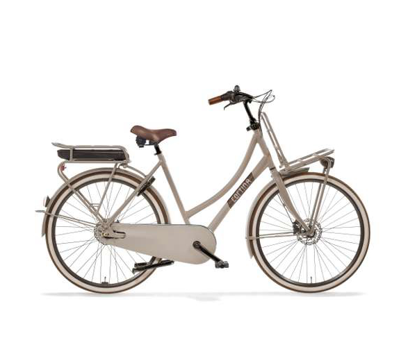 Cortina elektrische damesfiets Transport U4 in framemaat 50cm, Warm Sand Matte. Uitgerust met een Shimano Nexus 7 versnellingsnaaf, hydraulische schrijfremmen voor en achter, Bosch ActiveLine systeem met middenmotor, wordt geleverd ZONDER accu en acculader.
