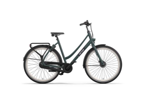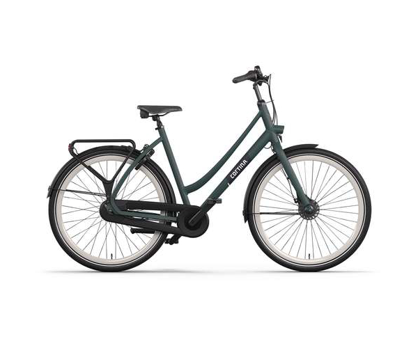 Cortina Tide damesfiets in framemaat 50cm. Kleur: Dark Juniper Green Matte. Uitgerust met achter een Shimano Nexus 7-traps versnellingsnaaf met rollerbrake en voor een Shimano naafdynamo met rollerbrake.